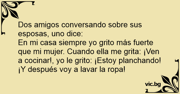 En mi casa siempre yo grito más fuerte que mi mujer. Cuando ella me grita: ¡Ven a cocinar!, yo le grito: ¡Estoy planchando! ¡Y después voy a lavar la ropa!