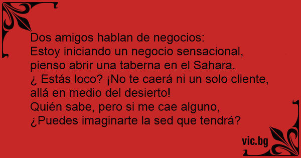 Dos amigos hablan de negocios: Estoy iniciando un negocio sensacional, pienso abrir una taberna en el Sahara. ¿ Estás lосо? ¡No te caerá ni un solo cliente, allá en medio del desierto! Quién sabe, pero si me cae alguno, ¿Puedes imaginarte la sed que tendrá?