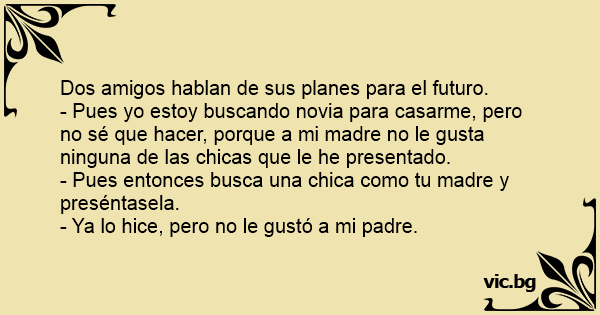 - Pues yo estoy buscando novia para casarme, pero no sé que hacer, porque a mi madre no le gusta ninguna de las chicas que le he presentado.