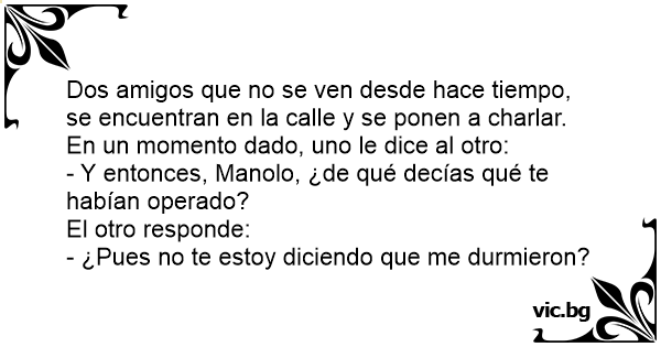 Dos amigos que no se ven desde hace tiempo, se encuentran en la calle y se ponen a charlar. En un momento dado, uno le dice al otro: