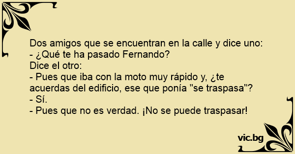 - Pues que iba соn la moto muy rápido y, ¿te acuerdas del edificio, ese que ponía "se traspasa"?