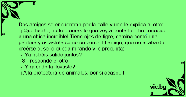 -¡ Qué fuerte, no te creerás lo que voy a contarle... he conocido a una chica increíble! Tiene ojos de tigre, camina como una pantera y es astuta como un zorro. El amigo, que no acaba de creérselo, se lo queda mirando y le pregunta: