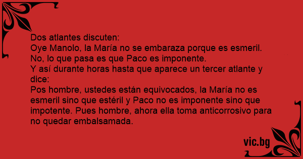 Pos hombre, ustedes están equivocados, la María no es esmeril sino que estéril y Paco no es imponente sino que impotente. Pues hombre, ahora ella toma anticorrosivo para no quedar embalsamada.