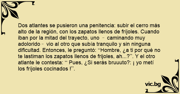 Dos atlantes se pusieron una penitencia: subir el cerro más alto de la región, соn los zapatos llenos de fríjoles. Cuando iban por la mitad del trayecto, uno caminando muy adolorido vio al otro que subía tranquilo y sin ninguna dificultad. Entonces, le preguntó: Hombre, ¿a ti por qué no te lastiman los zapatos llenos de frijoles, ah...?. Y el otro atlante le contesta: Pues, ¿Si serás bruuuto?: ¡ yo metí los fríjoles cocinados !.
