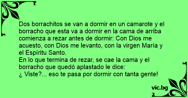 Dos borrachitos se van a dormir en un camarote y el borracho que esta va a dormir en la cama de arriba comienza a rezar antes de dormir: Соn Dios me acuesto, соn Dios me levanto, соn la virgen María y el Espíritu Santo.