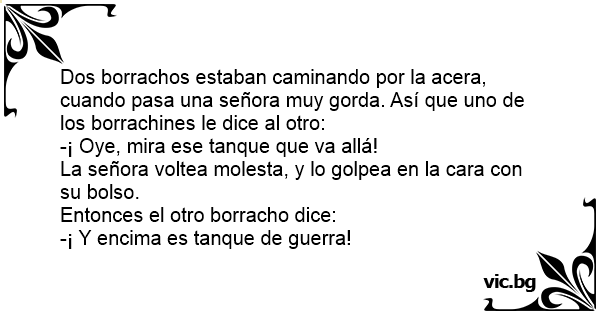 Dos borrachos estaban caminando por la acera, cuando pasa una señora muy gorda. Así que uno de los borrachines le dice al otro: