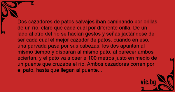 Dos cazadores de patos salvajes iban caminando por orillas de un río, claro que cada cual por diferente orilla. De un lado al otro del río se hacían gestos y señas jactándose de ser cada cual el mejor cazador de patos, cuando en eso, una parvada pasa por sus cabezas, los dos apuntan al mismo tiempo y disparan al mismo pato, al parecer ambos aciertan, y el pato va a caer a 100 metros justo en medio de un puente que cruzaba el río. Ambos cazadores corren por el pato, hasta que llegan al puente en donde los dos se acercan presurosos y uno toma el pato por el cuello y el otro por las patas, y se ponen a discutir, mientras tironean el pato.