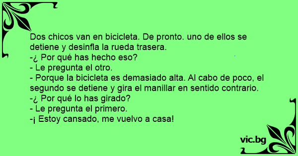 - Porque la bicicleta es demasiado alta. Al cabo de poco, el segundo se detiene y gira el manillar en sentido contrario.