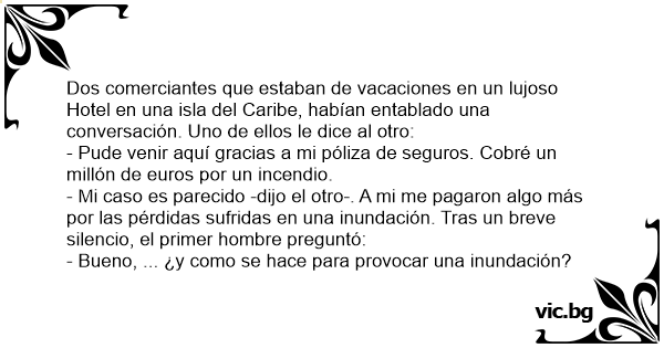 - Mi caso es parecido -dijo el otro-. A mi me pagaron algo más por las pérdidas sufridas en una inundación. Tras un breve silencio, el primer hombre preguntó: