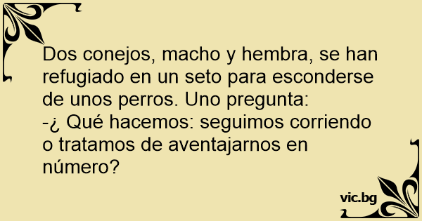 Dos conejos, macho y hembra, se han refugiado en un seto para esconderse de unos perros. Uno pregunta: