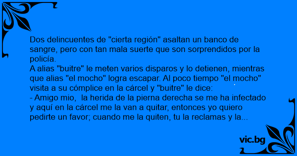 - Amigo mio, la herida de la pierna derecha se me ha infectado y aquí en la cárcel me la van a quitar, entonces yo quiero pedirte un favor; cuando me la quiten, tu la reclamas y la entierras en el jardín de mi casa.