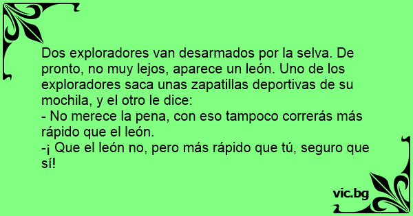 Dos exploradores van desarmados por la selva. De pronto, no muy lejos, aparece un león. Uno de los exploradores saca unas zapatillas deportivas de su mochila, y el otro le dice: