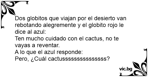 Una vez andaba mamá globo con su hijo globito paseando por el desierto. En eso, el hijo globito le dice a su mamá: ¡ Mamá, mamá, mira un cactusssssssssssssssssssssssssssssssss...........!