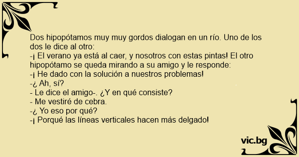 Dos hipopótamos muy muy gordos dialogan en un río. Uno de los dos le dice al otro: