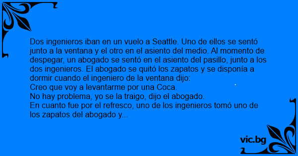 Dos ingenieros iban en un vuelo a Seattle. Uno de ellos se sentó junto a la ventana y el otro en el asiento del medio. Al momento de despegar, un abogado se sentó en el asiento del pasillo, junto a los dos ingenieros. El abogado se quitó los zapatos y se disponía a dormir cuando el ingeniero de la ventana dijo: