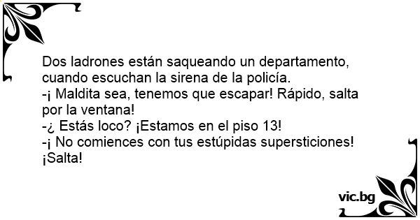 Two robbers were robbing a hotel. The first one said, "I hear sirens. Jump!" The second one said, "But we're on the 13th floor!" The first one screamed back, "This is no time to be superstitious."