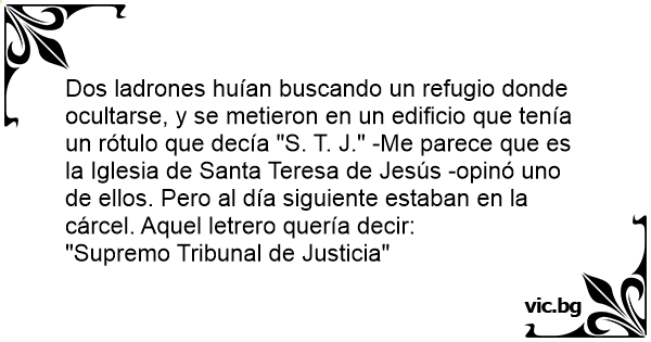 Dos ladrones huían buscando un refugio donde ocultarse, y se metieron en un edificio que tenía un rótulo que decía "S. T. J." -Me parece que es la Iglesia de Santa Teresa de Jesús -opinó uno de ellos. Pero al día siguiente estaban en la cárcel. Aquel letrero quería decir: