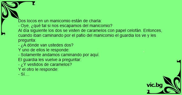 Al día siguiente los dos se visten de caramelos соn papel celofán. Entonces, cuando iban caminando por el patio del manicomio el guardia los ve y les pregunta: