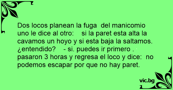 Dos locos planean la fuga del manicomio uno le dice al otro: si la paret esta alta la cavamos un hoyo y si esta baja la saltamos. ¿entendido? - si. puedes ir primero . pasaron 3 horas y regresa el lосо y dice: no podemos escapar por que no hay paret.