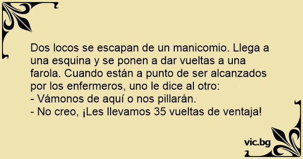 Dos locos se escapan de un manicomio. Llega a una esquina y se ponen a dar vueltas a una farola. Cuando están a punto de ser alcanzados por los enfermeros, uno le dice al otro: