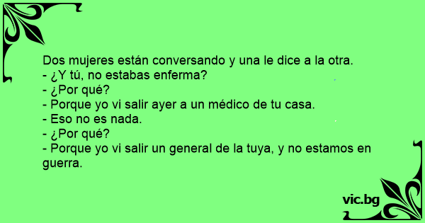 Болна Две комшийки на село си говорят през оградата и едната вика: Ήταν 2 γειτόνισσες και λέει η μία στην άλλη: Spotykają się dwie nieprzepadające ze sobą sąsiadki: - A cóż to, źle się pani dziś czuła, pani Kowalska? -pyta jedna z nich. Chorowała pani w nocy? - Skąd to pani przyszło do głowy? - odparskuje... Conversa entre vizinhas: — Petra, você está doente? Pergunto porque vi sair um médico de sua casa hoje de manhã. — Olha lá! Ontem de manhã eu vi sair um coronel da sua casa e não estamos em guerra. To nabodamer snakket sammen over hekken: – Kjære, er du syk? – Hvorfor tror du det? – Jeg så en lege som gikk av huset ditt i dag. – Så når jeg så at det gikk en general ut av huset ditt, betyr det... Una vecina le dice a otra: - ¿Consuelo, no estabas enferma? Consuelo dice: - ¿Por qué lo dices? - Pero Consuelo, si vi salir un médico de tu casa. - Eso no es nada, porque yo vi salir un general... - Carmen, ¿estás enferma? Te lo pregunto porque vi salir a un médico de tu casa, esta mañana. - Mirá, ayer por la mañana yo vi salir a un militar de la tuya, y no estamos en guerra. Δύο γειτόνισσες συναντιούνται στην λαϊκή. - Καλημέρα Μαρία μου. Τις τελευταίες μέρες παρατήρησα τον γιατρό, άθελά μου, να μπαινοβγαίνει στο σπίτι σου. Ήσουν άρρωστη; - Γιατί Ελένη μου; Σε σένα που...