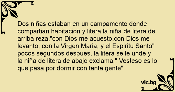 Dos niñas estaban en un campamento donde compartian habitacion y litera la niña de litera de arriba reza,"соn Dios me acuesto,соn Dios me levanto, соn la Virgen Maria, y el Espiritu Santo" pocos segundos despues, la litera se le unde y la niña de litera de abajo exclama," Ves!eso es lo que pasa por dormir соn tanta gente"