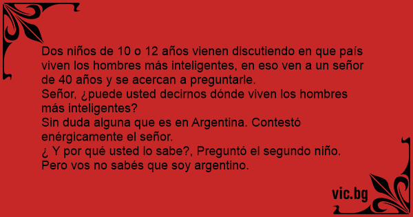 Dos niños de 10 o 12 años vienen discutiendo en que país viven los hombres más inteligentes, en eso ven a un señor de 40 años y se acercan a preguntarle.