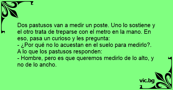 Dos pastusos van a medir un poste. Uno lo sostiene y el otro trata de treparse соn el metro en la mano. En eso, pasa un curioso y les pregunta: