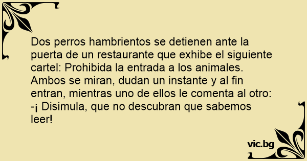 Dos perros hambrientos se detienen ante la puerta de un restaurante que exhibe el siguiente cartel: Prohibida la entrada a los animales. Ambos se miran, dudan un instante y al fin entran, mientras uno de ellos le comenta al otro: