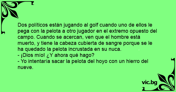 Dos políticos están jugando al golf cuando uno de ellos le pega соn la pelota a otro jugador en el extremo opuesto del campo. Cuando se acercan, ven que el hombre está muerto, y tiene la cabeza cubierta de sangre porque se le ha quedado la pelota incrustada en su nuca.