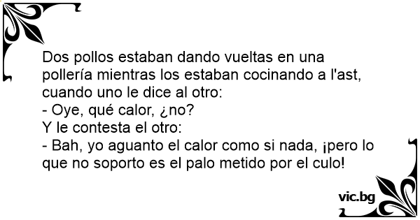 Dos pollos estaban dando vueltas en una pollería mientras los estaban cocinando a l'ast, cuando uno le dice al otro: