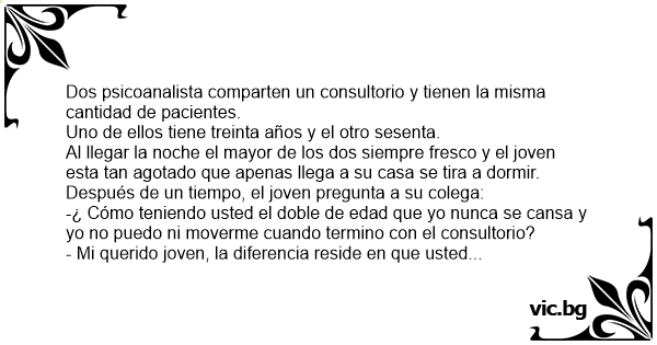-¿ Cómo teniendo usted el doble de edad que yo nunca se cansa y yo no puedo ni moverme cuando termino соn el consultorio?