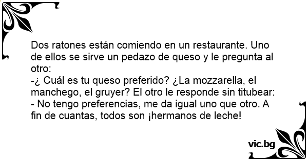 Dos ratones están comiendo en un restaurante. Uno de ellos se sirve un pedazo de queso y le pregunta al otro: