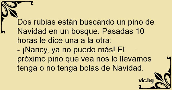Dos rubias van al bosque para buscar un pino, el cual usar como arbolito de navidad. Luego de varias horas de búsqueda, una muy cansada le dice a la otra: - Oye, ya fue suficiente. El siguiente pino que veamos lo llevamos, ¡tenga o no tenga bolas de Navidad!.
