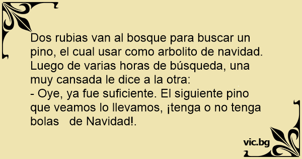 Dos rubias están buscando un pino de Navidad en un bosque. Pasadas 10 horas le dice una a la otra: - ¡Nancy, ya no puedo más! El próximo pino que vea nos lo llevamos tenga o no tenga bolas de Navidad.