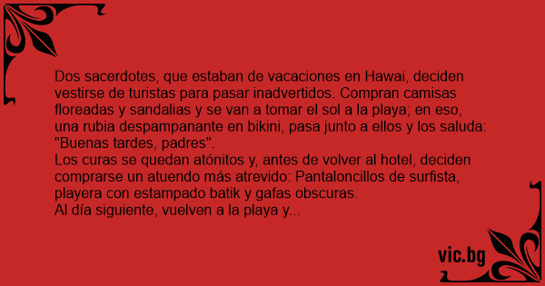 Dos sacerdotes, que estaban de vacaciones en Hawai, deciden vestirse de turistas para pasar inadvertidos. Compran camisas floreadas y sandalias y se van a tomar el sol a la playa; en eso, una rubia despampanante en bikini, pasa junto a ellos y los saluda: