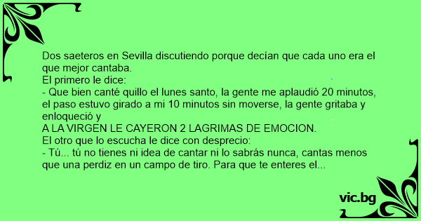 - Tú... tú no tienes ni idea de cantar ni lo sabrás nunca, cantas menos que una perdiz en un campo de tiro. Para que te enteres el Martes santo, desde mi balcón le canté una saeta al Cristo, que las palmas de la gente se escucharon en la Torre del Oro mas de una hоrа, la procesión se paró, los nazarenos dejaron los tronos en el suelo y salieron para aplaudirme mas de una hоrа y el CRISTO se quito los clavos, se bajo del trono y subió las escaleras a mi balcón, llegó hasta mi y me dio un abrazo diciendo.... ¡¡¡¡ TU SI QUE CANTAS BIEN.... Y NO EL DESGRACIADO ESE, QUE AYER LE HIZO LLORAR A MI MADRE !!!!!