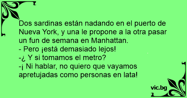 Dos sardinas están nadando en el puerto de Nueva York, y una le propone a la otra pasar un fun de semana en Manhattan.
