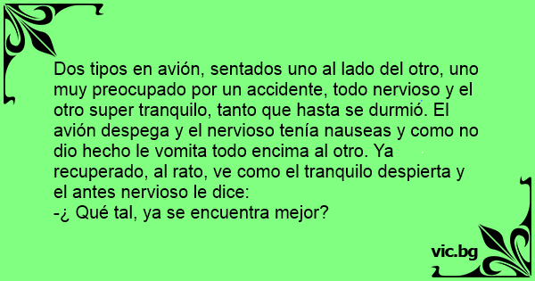 Dos tipos en avión, sentados uno al lado del otro, uno muy preocupado por un accidente, todo nervioso y el otro super tranquilo, tanto que hasta se durmió. El avión despega y el nervioso tenía nauseas y como no dio hecho le vomita todo encima al otro. Ya recuperado, al rato, ve como el tranquilo despierta y el antes nervioso le dice: