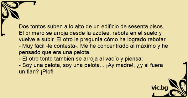 Dos tontos suben a lo alto de un edificio de sesenta pisos. El primero se arroja desde la azotea, rebota en el suelo y vuelve a subir. El otro le pregunta cómo ha logrado rebotar.