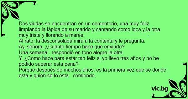 Dos viudas se encuentran en un cementerio, una muy feliz limpiando la lápida de su marido y cantando como loca y la otra muy triste y llorando a mares.