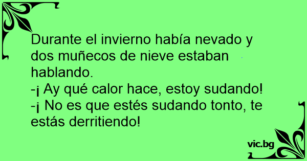 Durante el invierno había nevado y dos muñecos de nieve estaban hablando.<br />-¡ Ay qué calor hace, estoy sudando!<br />-¡ No es que estés sudando тоnто, te estás derritiendo!
