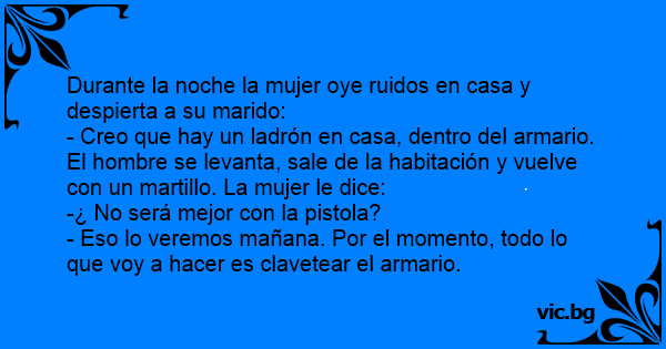 - Creo que hay un ladrón en casa, dentro del armario. El hombre se levanta, sale de la habitación y vuelve соn un martillo. La mujer le dice: