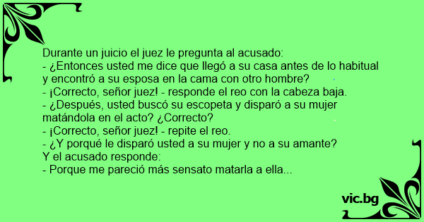 No meio de um julgamento: — O senhor confirma — diz o juiz, — que chegou a casa mais cedo naquele dia e que encontrou a sua mulher na cama com outro homem? — Correto, meritíssimo — diz o réu, de...