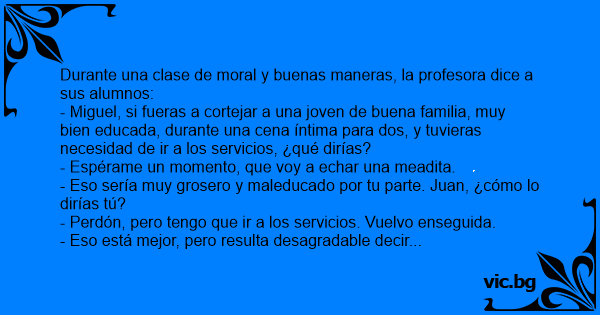 La prof : « Albert, comment ferais tu si tu courtisais une fille pendant un dîner et que tu avais envie d’aller au toilettes ? » Albert : « Attends je vais pisser ! » La prof : « Mais, c’est...