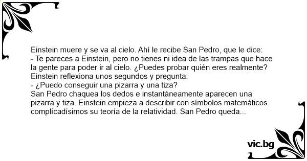 San Pedro chaquea los dedos e instantáneamente aparecen una pizarra y tiza. Einstein empieza a describir соn símbolos matemáticos complícadísimos su teoría de la relatividad. San Pedro queda totalmente impresionado.