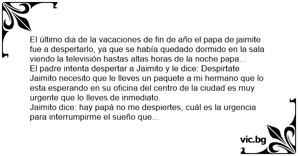 El padre intenta despertar a Jaimito y le dice: Despirtate Jaimito necesito que le lleves un paquete a mi hermano que lo esta esperando en su oficina del centro de la ciudad es muy urgente que lo lleves de inmediato.