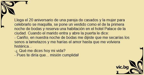Llega el 20 aniversario de una pareja de casados y la mujer para celebrarlo se maquilla, se pone un vestido como el de la primera noche de bodas y reserva una habitación en el hotel Palace de la ciudad. Cuando el marido entra y abre la puerta le dice:
