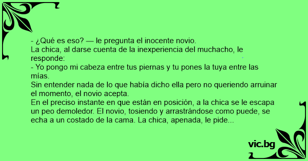 En el preciso instante en que están en posición, a la chica se le escapa un peo demoledor. El novio, tosiendo y arrastrándose como puede, se echa a un costado de la cama. La chica, apenada, le pide que la disculpe, que no va a volver a suceder. Nuevamente, toman la posición de ataque y, cuando van a comenzar, a la chica se le escapa otro peo. El novio se levanta, mareado y "turulato", y comienza a vestirse.