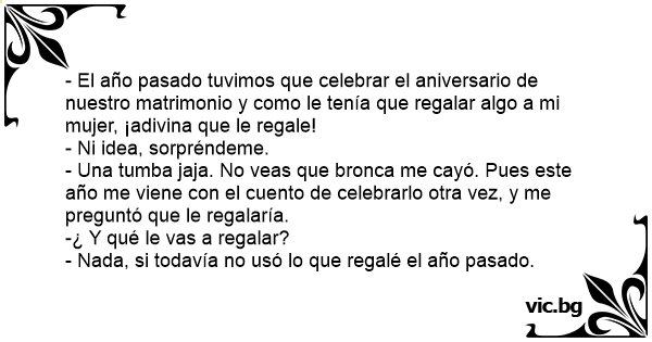 - El año pasado tuvimos que celebrar el aniversario de nuestro matrimonio y como le tenía que regalar algo a mi mujer, ¡adivina que le regale!
